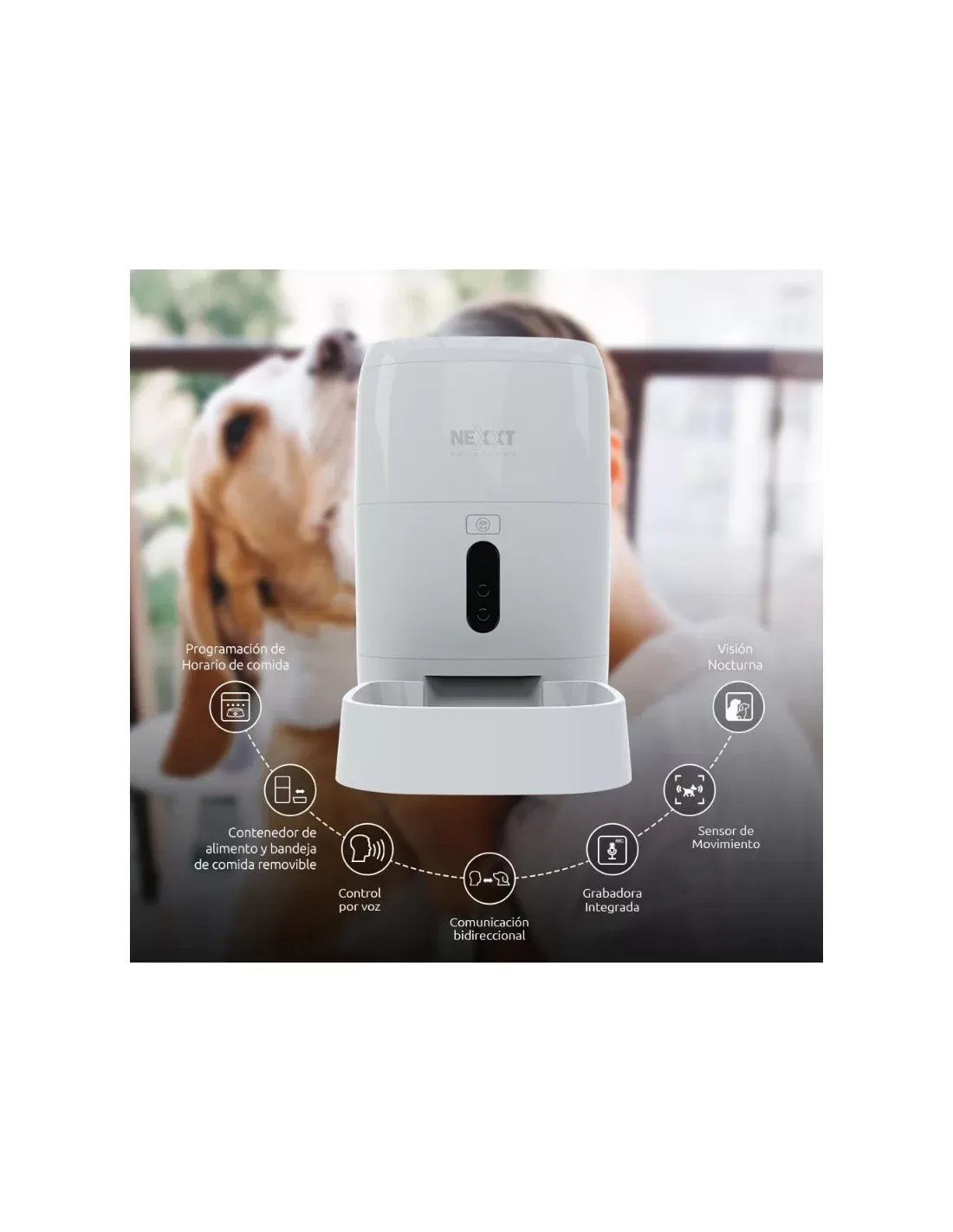 Por mucho que quieras a tu adorada mascota, es un fastidio tener que levantarte de madrugada sólo para ver si la criaturita ha comido o no. Ya es hora de relajarte, en serio. Simplemente deja que el Dispensador inteligente Wi-Fi de alimento para mascotas de Nexxt Solutions se encargue de todo. Este innovador dispensador permite que un perro o gato obtenga fácilmente su comida, siempre a tiempo y en la proporción perfecta según sus necesidades de nutrición. Este dispositivo no sólo promueve hábitos alimentarios más saludables mediante la programación de horarios, sino que también permite controlar la frecuencia y la cantidad de alimento dispensado en cualquier momento y desde cualquier lugar, a través de un teléfono inteligente o tableta.»